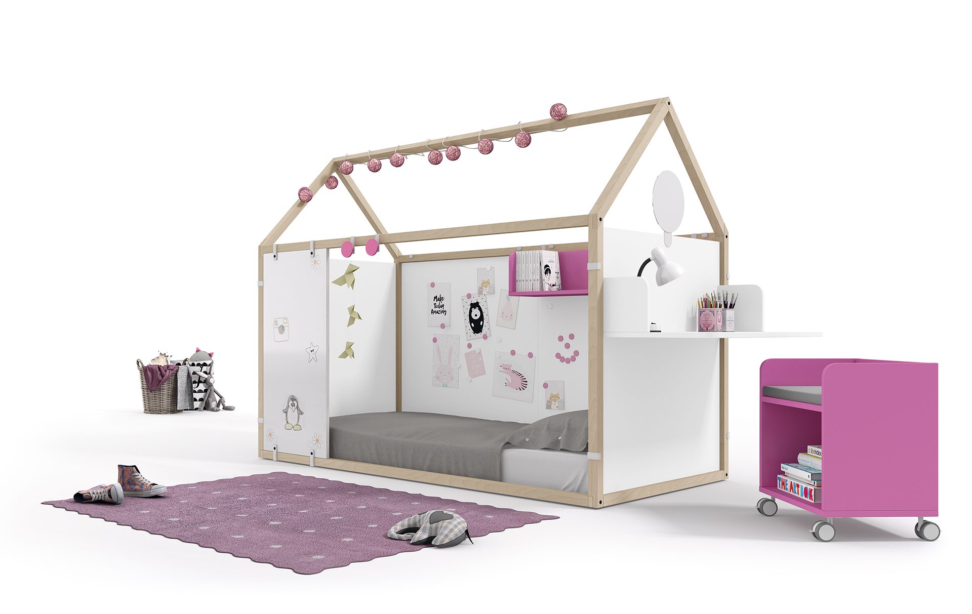 Velkou oblibu si získaly naše domečkové postele s interaktivními prvky jako magnetické tabule nebo popisovací tabule. Je na ně možné zavěsit různé poličky, háčky nebo záclonky.