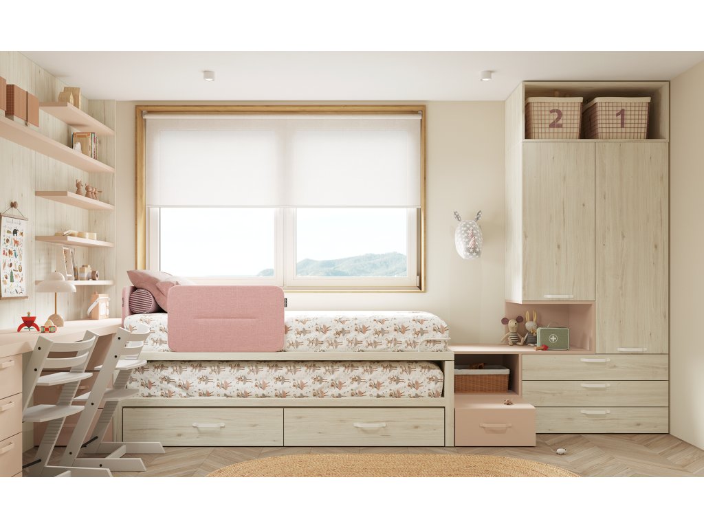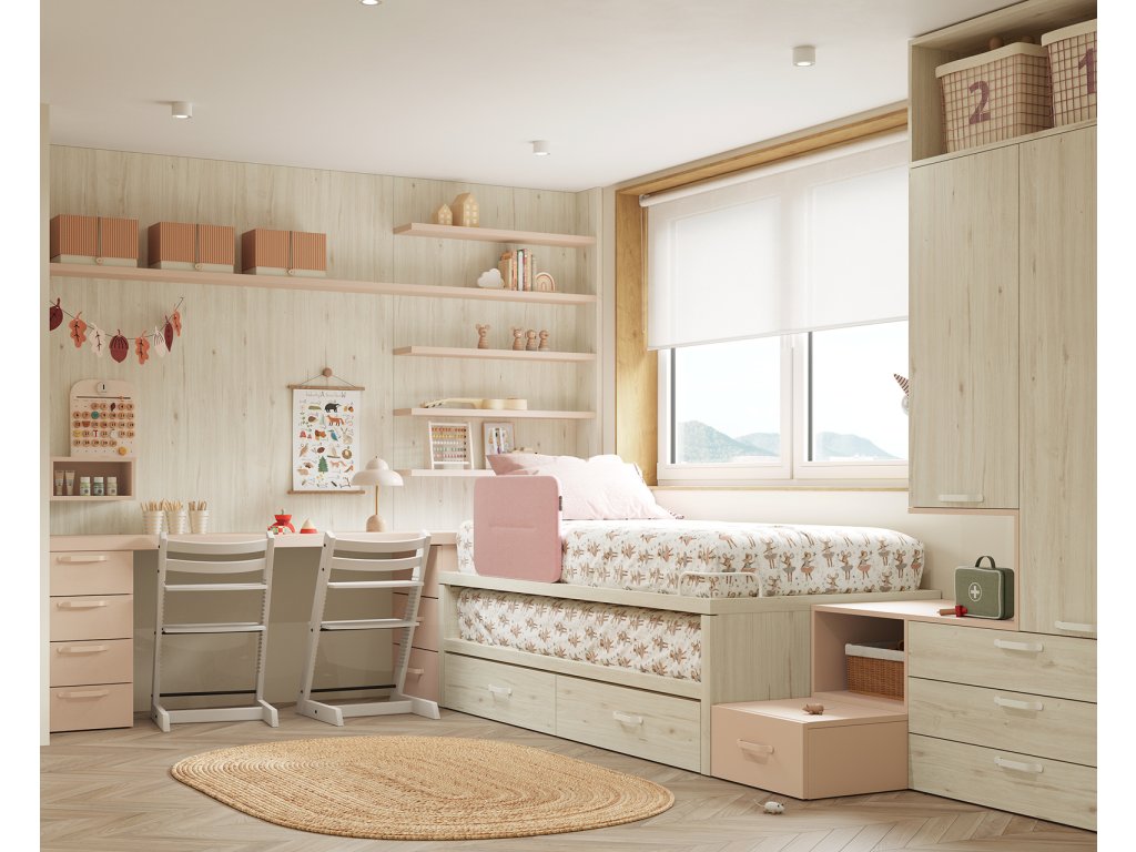 V kompozici dětského pokoje najdeme vyšší postel s druhým výsuvným lůžkem a zásuvkami velkou 204 x 100 cm, na kterou se dítě pohodlně dostane po navazujících schůdkách s úložným prostorem. Z druhé strany na postel navazuje psací stůl dostatečně dlouhý pro dvě deti se zásuvkovými kontejnery. Nechybí ani šatní skříň s nikou a nástěnné police.