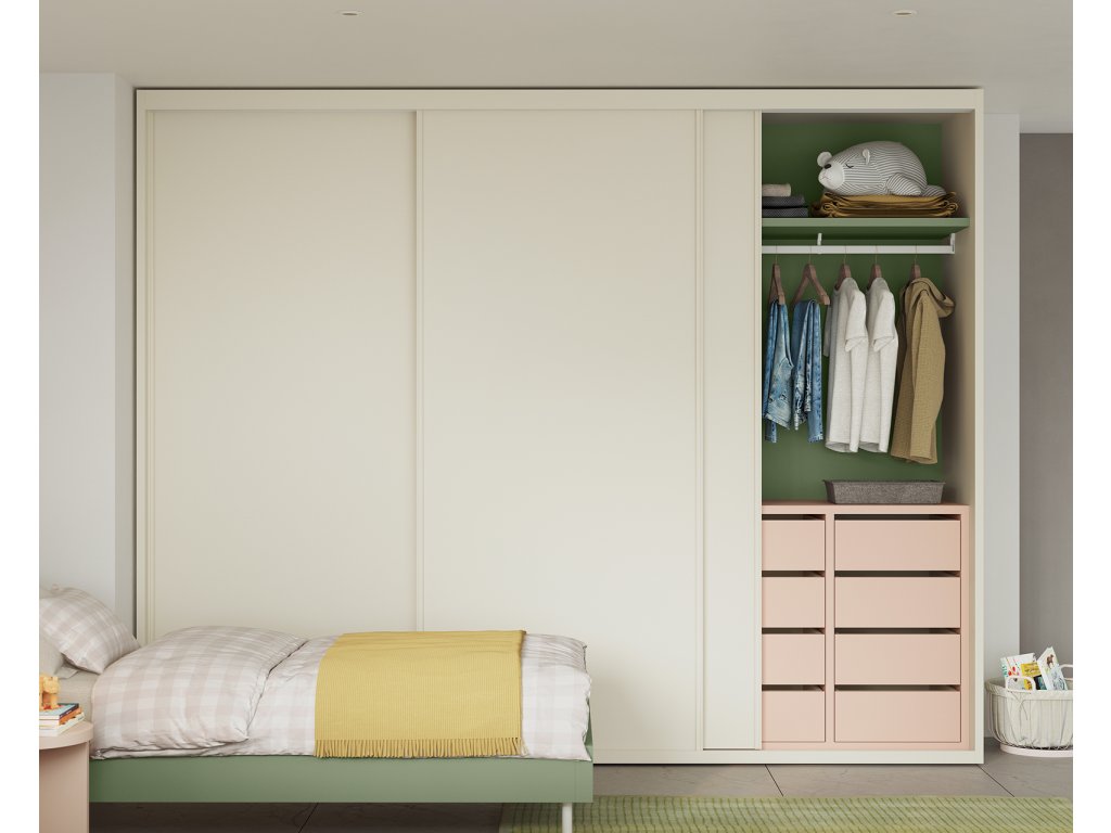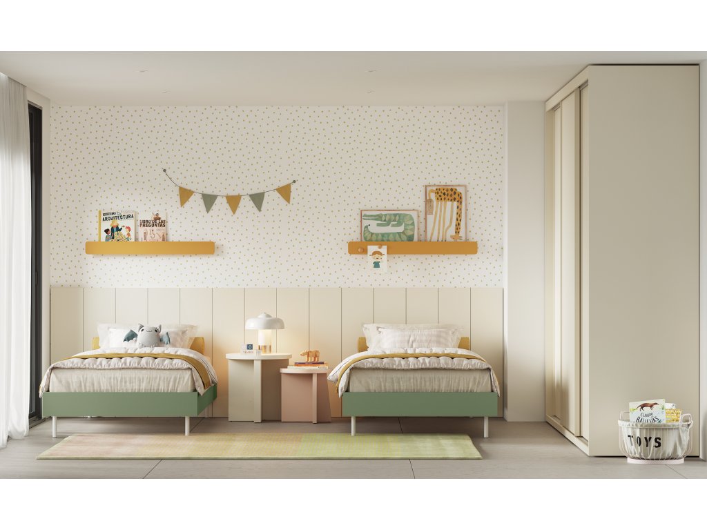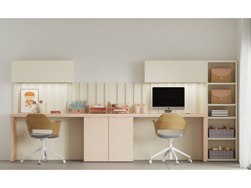 Tento dětský pokoj je rozdělen na dvě zóny. V spací zóně jsou dvě postele 105 x 205 cm s nástěnným čelem podél celé zdi a dvěmi policemi. Prostor ozvláštňují designové noční stolky. Do prostorné šatní skříně s posuvnými dveřmi se vejde všechno oblečení i hračky. V studijní zóně se nachází dlouhý psací stůl s kontejnery, otevřenou knihovničkou a nástěnnými úložnými moduly.