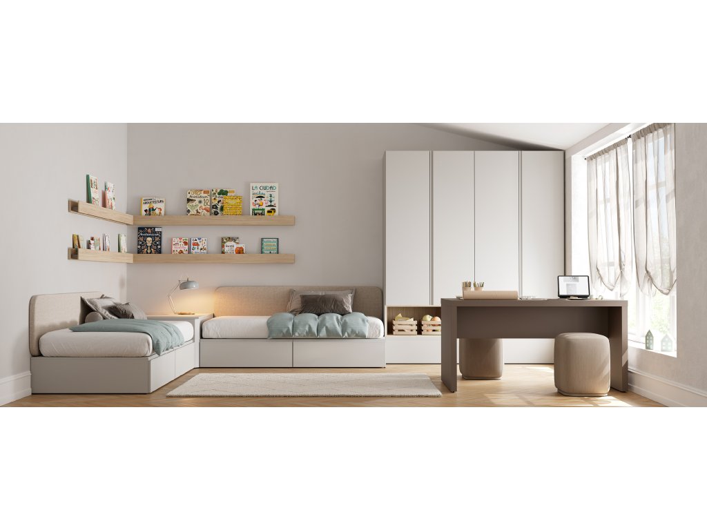 Kompozice dětského pokoje pro dvě děti nabízí dvě postele s úložnými zásuvkami 100 x 200 cm a čalouněnými čely. Mezi postelemi je navíc praktický rohový úložný modul a na zdi police na knížky nebo obrázky. Na postel navazuje prostorná šatní skříň s otevřenou nikou a kompozici dolňuje psací stůl.