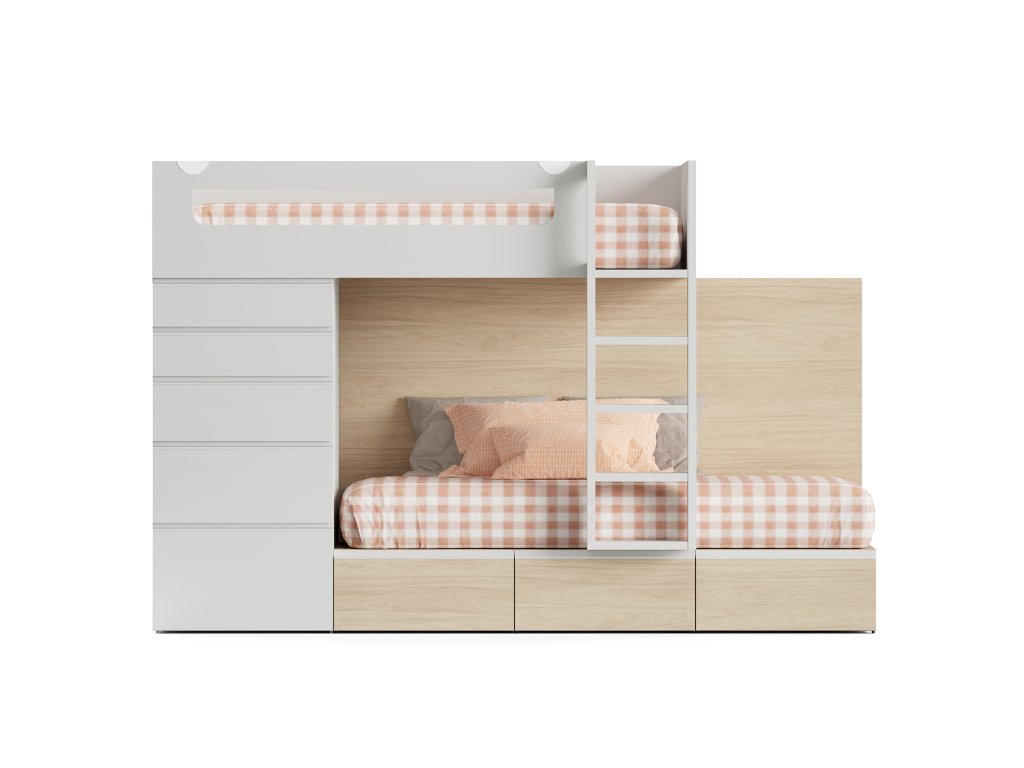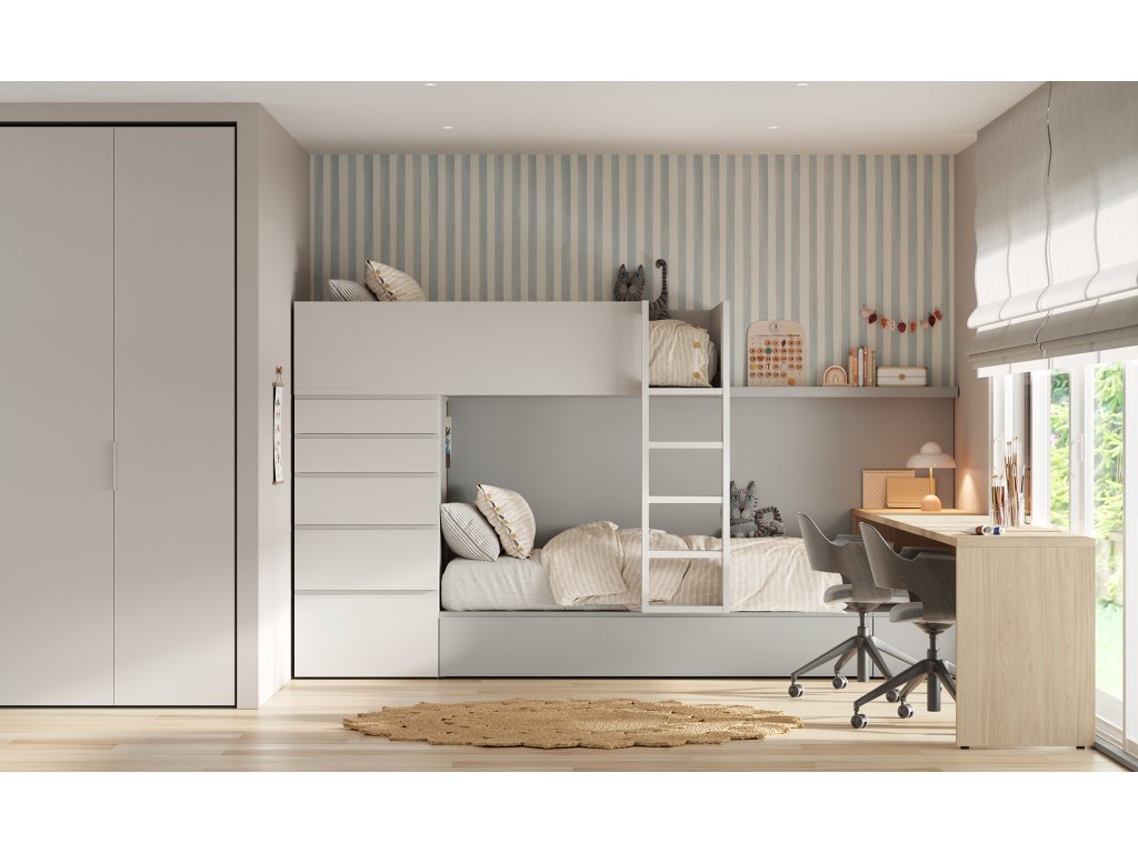 Kompozici patrové postele se žebříkem, zásuvkovou skříní s nikou a dalším výsuvným lůžkem s navazujícím psacím stolem a nástěnnou policí doplňuje šatní skříň se skládacími dveřmi. Palanda je vhodná pro matrace 95x195cm a ve výsuvu 90x195cm. Palanda má variabilní úložné prostory (viz obrázky) - v případě zájmu rádi naceníme.