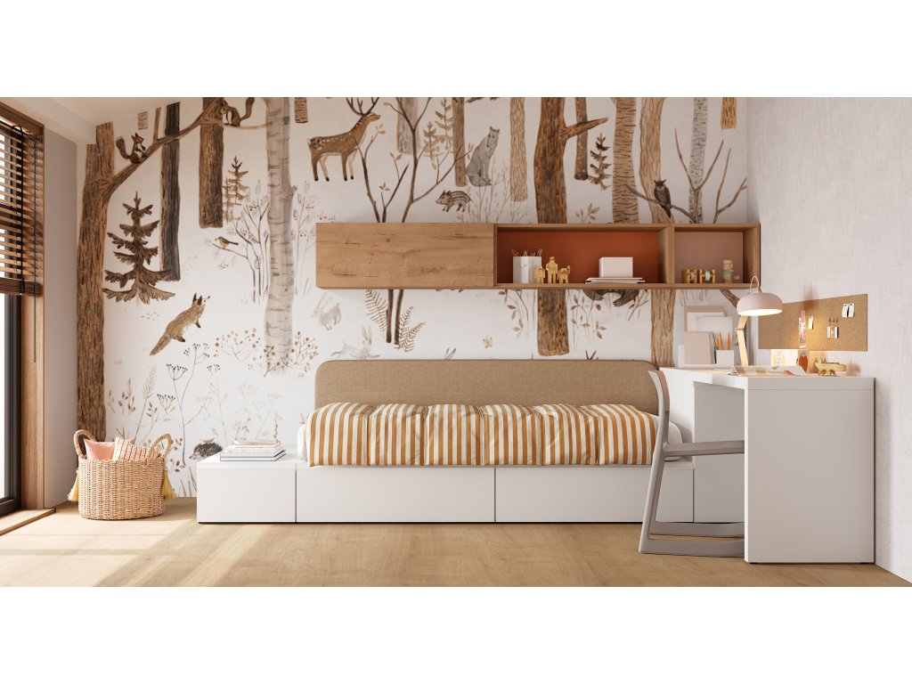 Kompozice dětského pokoje nabízí postel se zásuvkami 250 x 100 cm (pro matraci 200 x 100 cm) a čalouněným čelem. Na postel navazuje psací stůl s výsuvným kontejnerem, čím je využitý i rohový prostor. Díky kombinaci otevřených a zavřených nástěnných modulů působí pokoj vzdušně a útulně.