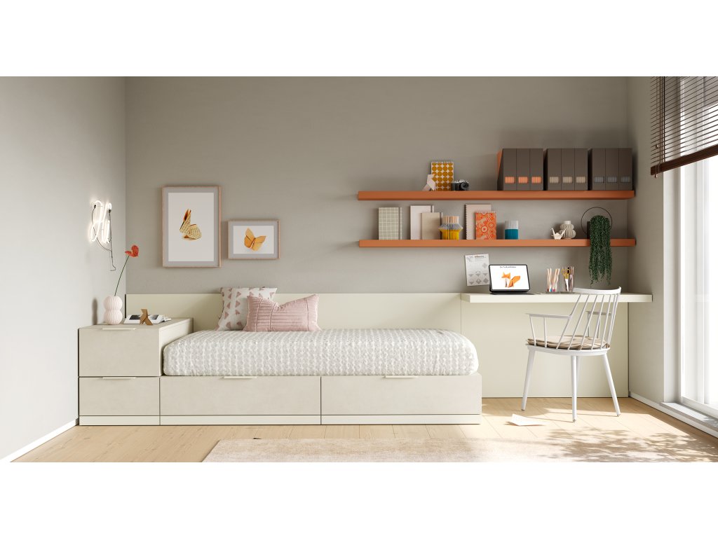 Sestava postele 100x200 cm se zásuvkami, čelem se zásuvkami, zády, navazujícím nástěnným psacím stolem a barevnými policemi.