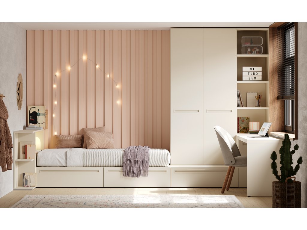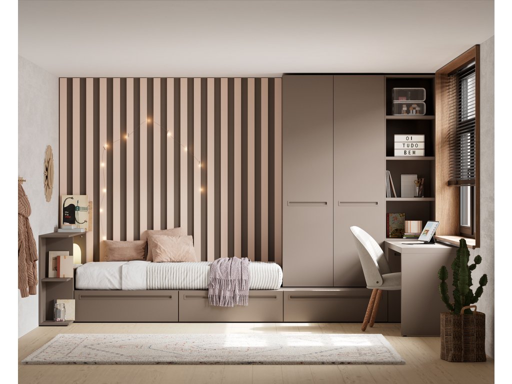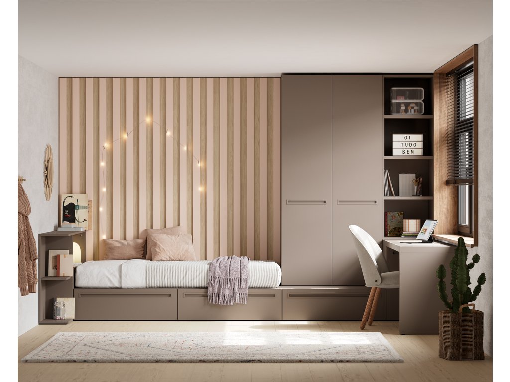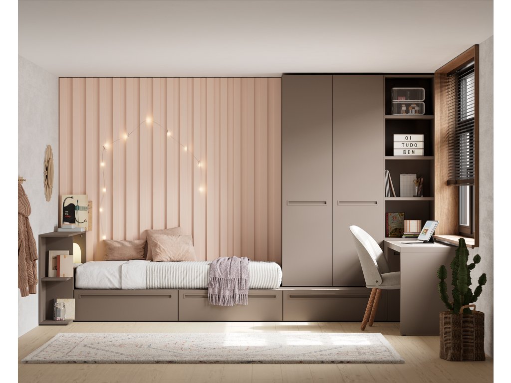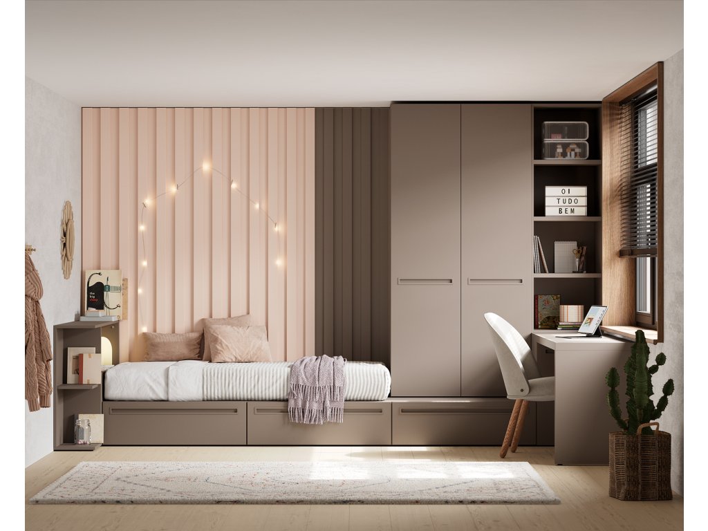 Kompozice postele 100x200 cm se zásuvkami, peřinákem s nikou a poličkami v čele postele, navazující šatní skříní s otevřenou knihovnou a psacím stolem. Dominantou pokoje je dizajnový nástěnný panel, který lze různě barevně kombinovat - viz obrázky