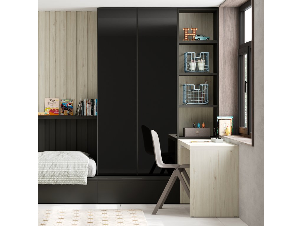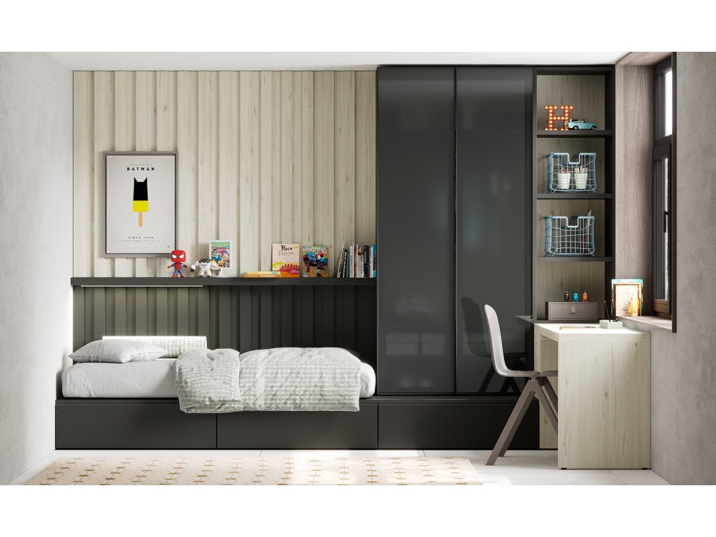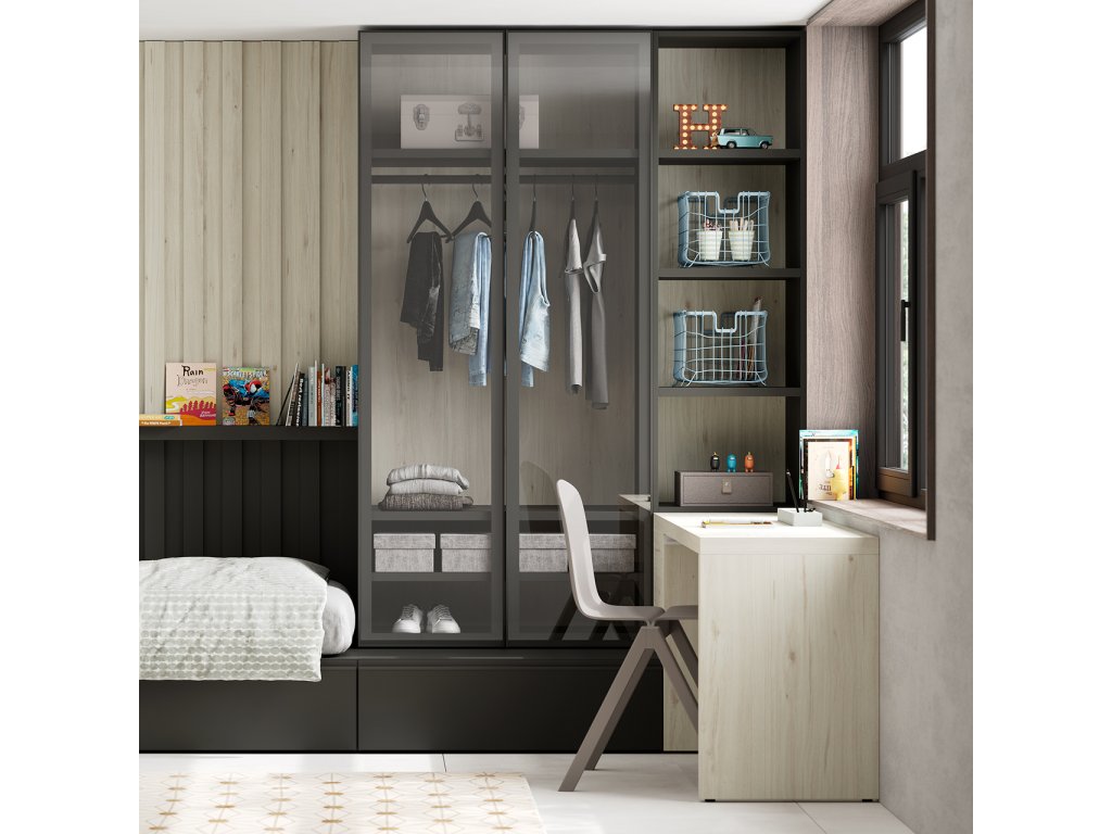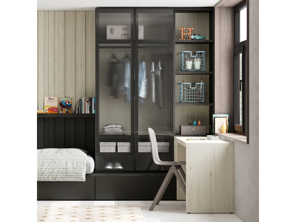Kompozice postele 100x200 cm se zásuvkami, s navazující šatní skříní s prosklennými dveřmi, otevřenou knihovnou a psacím stolem. Dominantou pokoje je dizajnový nástěnný panel s policí. V nabídce máme různé typy prosklení dveří - viz obrázky.