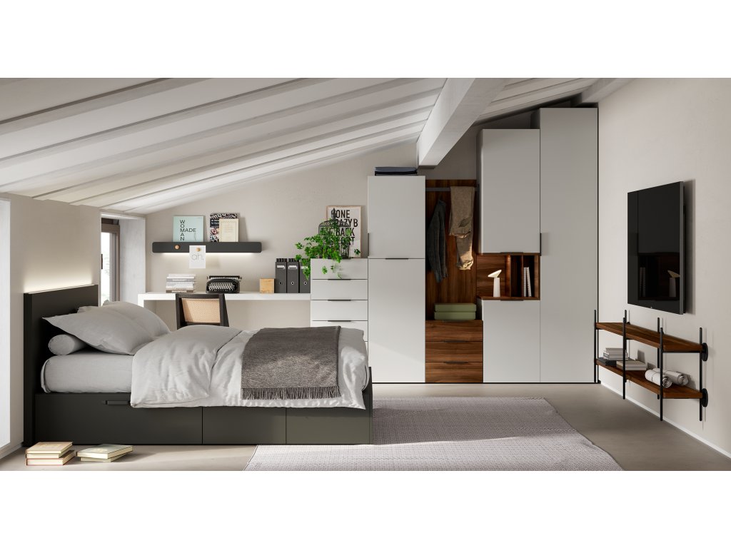 Sestava nábytku s postelí 160x200 cm se šesti zásuvkami a čelem se zafrézovaným LED osvětlením. Psací stůl navazuje na dizajnovou šatní skříň s otevřeným prostorem na věšení. Nad psacím stolem je kovová police s LED osvětlením. Skříně je možné navrhnout zcela na míru. Také vnitřní vybavení je možné uzpůsobit podle vlastních požadavků. V ceně také policový systém pod TV.