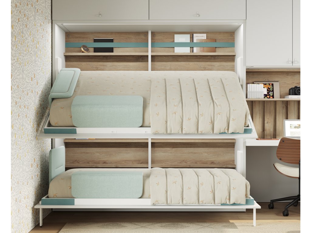 Patrová sklopná postel pro dvě děti (vhodná pro matrace 190x90cm) s žebříkem, vnitřími poličkami s LED podsvícením, čalouněnými čely a bočními zábranami. Na postel navazuje prostorný rohový psací stůl se zásuvkovým kontejnerem a dvéřovou nástěnnou skříňkou se dvěmi otevřenými moduly.