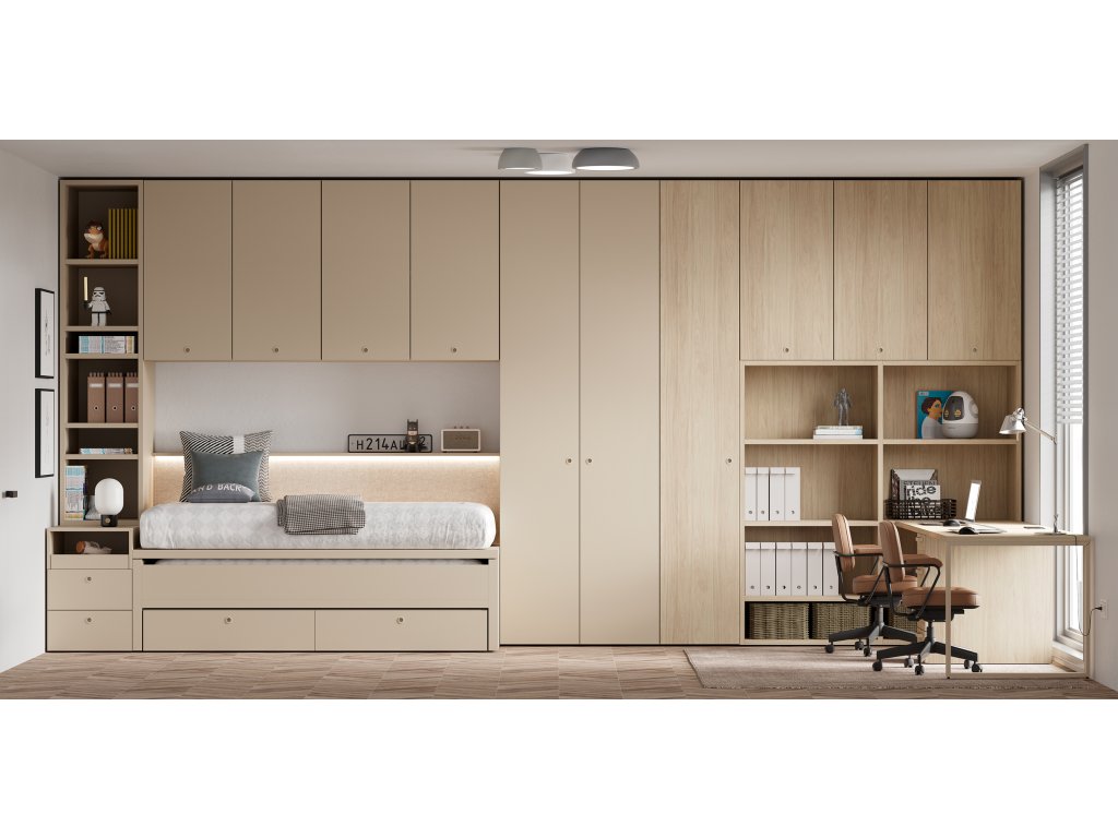Sestava nabízí bohaté uzavřené i otevřené úložné prostory s postelí 100x200 cm s druhým výsuvným lůžkem, podsvícenou polici nad postelí a psací stůl navazující na knihovnu.