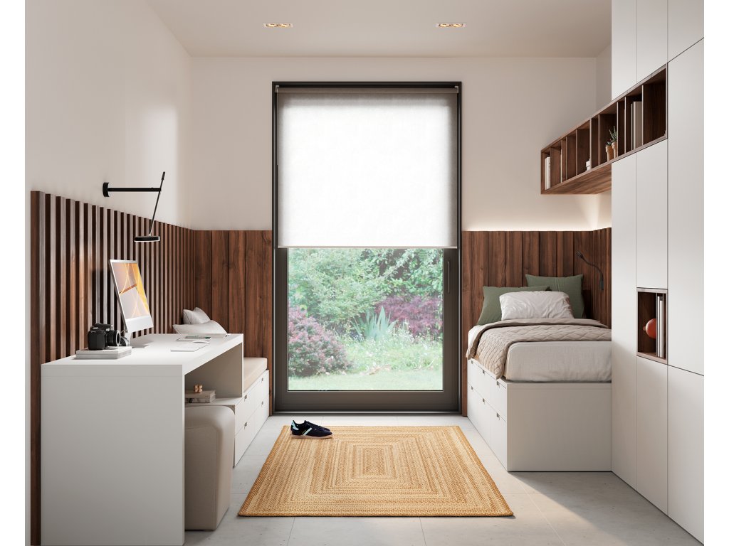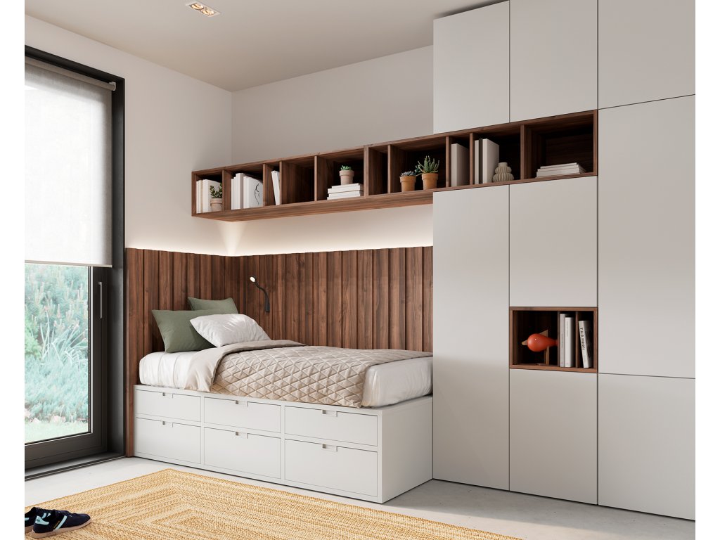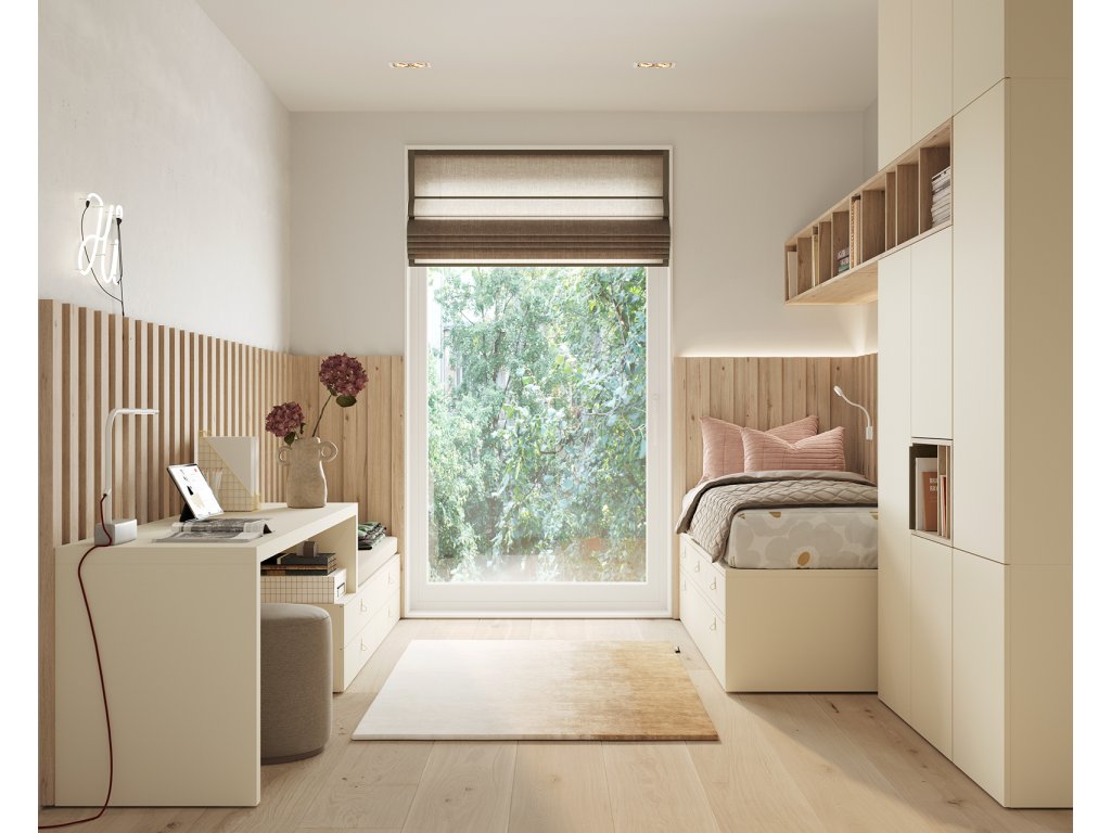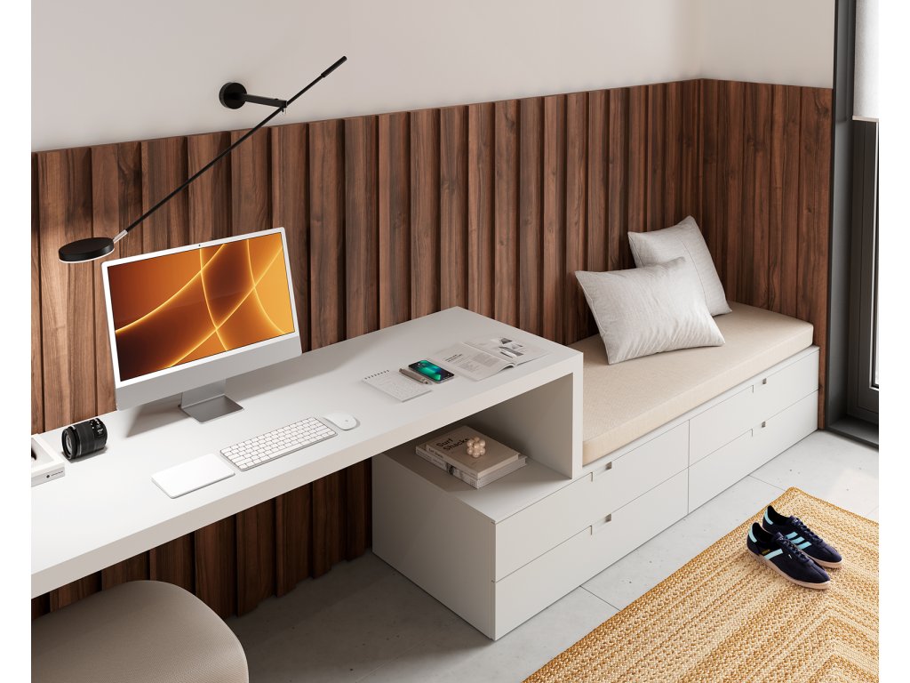 Sestava nábytku, kde dominantu pokoje tvoří designové obložení stěn. Sestava nabízí: vyšší postel se 6 šuplíky 200x100x50cm, designová prostorná šatní skříň s nikou a přečnívající policí, psací stůl navazující na 4 zásuvkové sezení. Nástěnné panely je možné opatřit zafrézovaným LED osvětlením.
