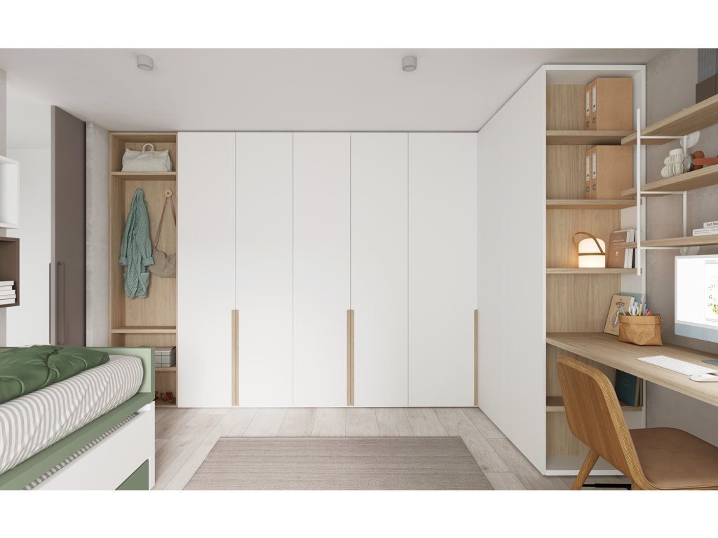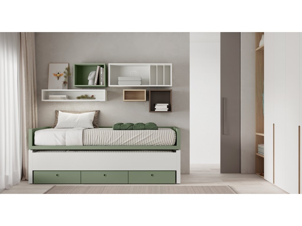 Kompozice nábytku nabízí barevnou postel s přistýlkou a třemi zásuvkami (vhodnou pro matrace 190x90 cm) a otevřené nástěnné moduly. Dominantou pokoje je prostorná rohová šatní skříň s otevřenou nikou na roznošené oblečení a knihovnou s navazujícím psacím stolem. Další úložný prostor nabízí policový systém nad psacím stolem.