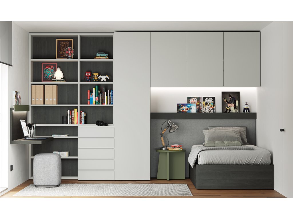 Nábytková sestava kombinuje otevřené i uzavřené úložné prostory s postelí 100x200cm, čalouněným čelem postele s policí a sklopným psacím stolkem s policí s LED podsvícením. Postel má úložný prostor s výklopným roštem vhodným pro matraci 194x94 cm. Skříňky je možné vybavit LED osvětlením.