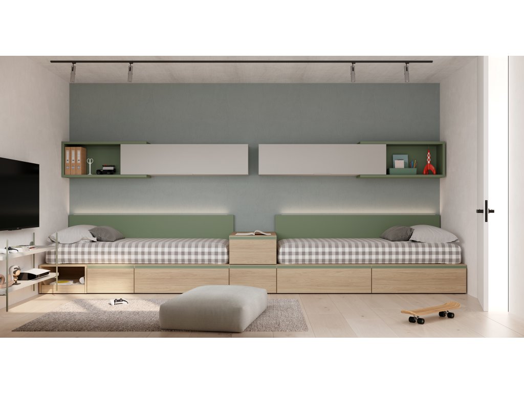 Kompozice dvou postelí 100x200 cm s úložnými zásuvkami, barevnými čely s LED podsvícením a nástěnnými moduly s výklopnými dvířky.