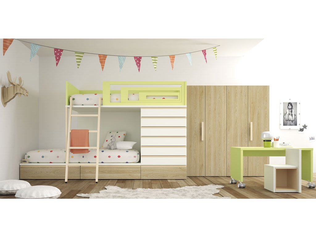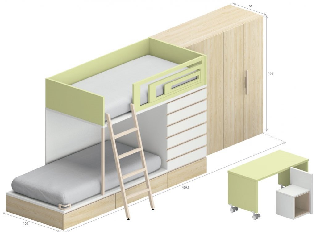 - Patrovou postel s úložným prostorem a posunutým spodním lůžkem (š. 276 cm x h. 100 cm x v. 162 cm)