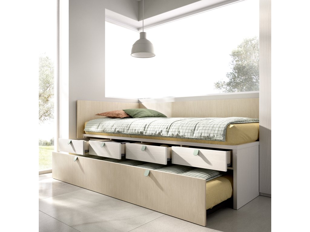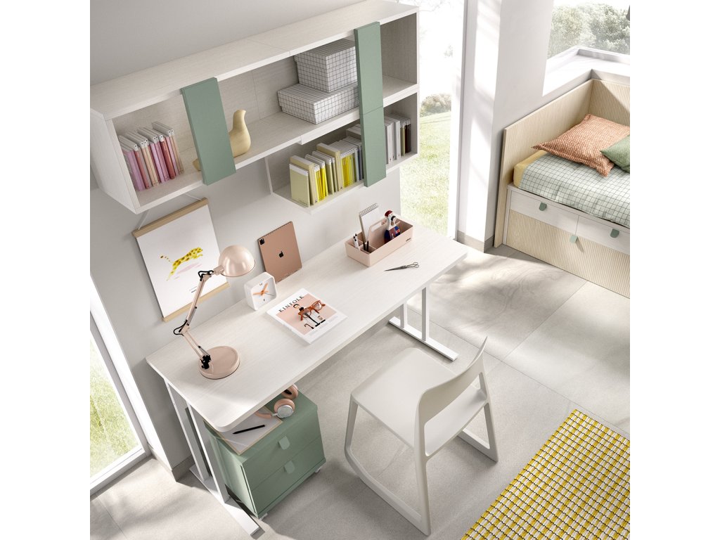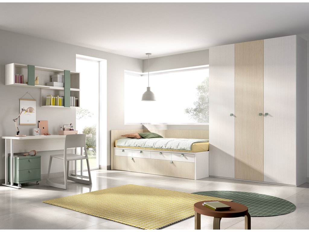 Nábytková sestava C101 od španělského výrobce Rimobel nabízí jedno lůžko fixní a jedno výsuvné. Nad výsuvnou postelí jsou umístěné i zásuvky s úložným prostorem. Třídveřouvou šatní skříň doplňuje psací stůl s kovovýma nohama, dvouzásuvkovým kontejnerem na kolečkách a otevřený nástěnný modul. Postel je pro matraci 100 x 200 cm.
