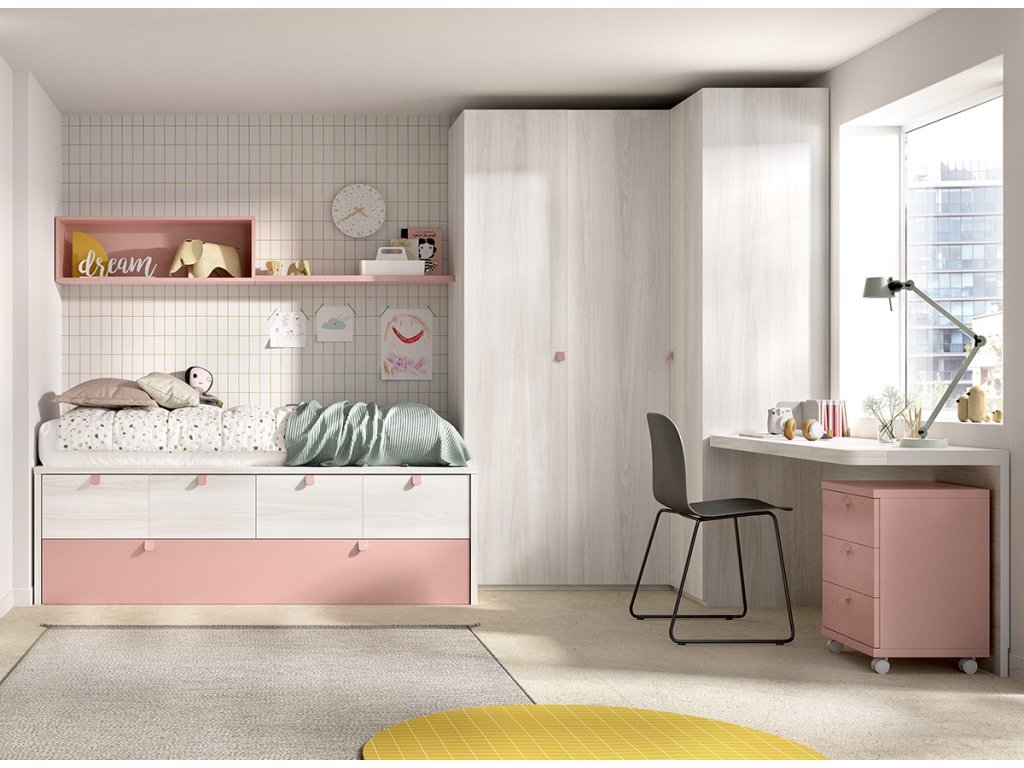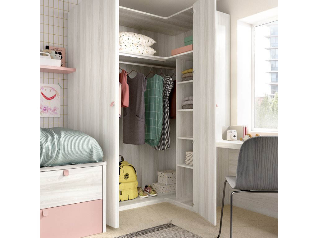 Studentský pokoj C108 nabízí praktické řešení rohové šatní skříně, na kterou navazuje psací stůl s mobilním kontejnerem a vyšší postel s úložnými prostory a dalším výsuvným lůžkem. Nechybí ani nástěnné poličky nad postelí.