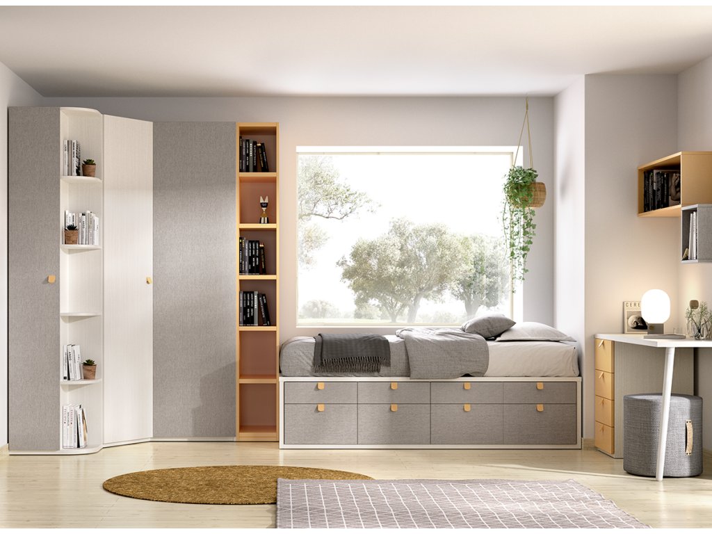Dobře využitý prostor pokoje pro studenta či studentku - prostorná rohová šatní skříň s otevřenými policemi, postel s úložnými zásuvkami, nástěnné moduly a stůl se zásuvkovým kontejnerem. To vše v praktickém řešení a minimalistickém designu