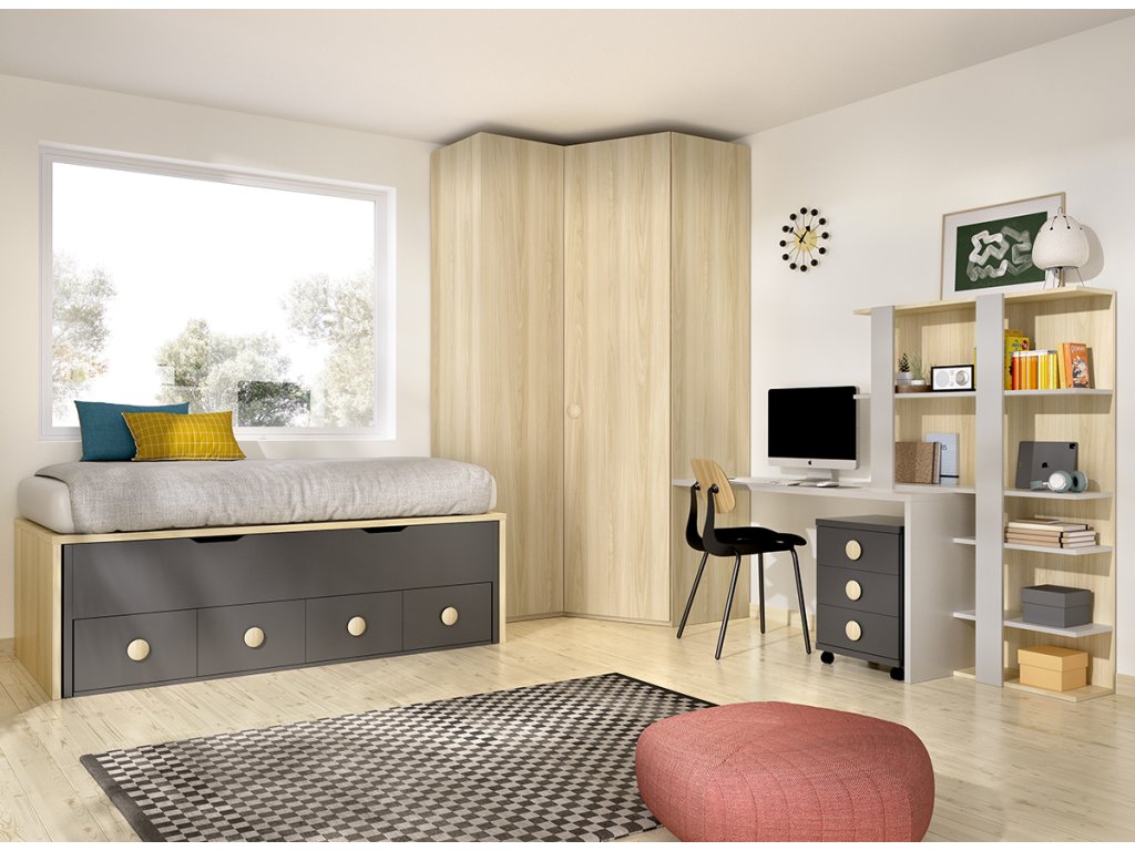 Studentský pokoj C117 nabízí praktické řešení rohové šatní skříně, na kterou navazuje psací stůl s mobilním kontejnerem a designovou knihovnou a vyšší postel s úložnými prostory a dalším výsuvným lůžkem.