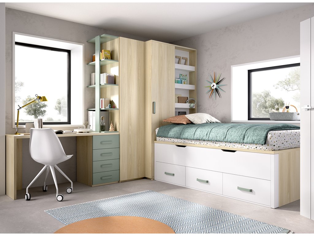 Plně vybavený studentský pokoj v sestavě Rimobel C125 představuje praktické řešení, které šetří místo a přitom nabízí množství úložného prostoru - zásuvky pod vyvýšenou postelí s dalším výsuvným lůžkem, rohová skříň s knihovnou, navazující psací stůl se zásuvkovým kontejnerem.