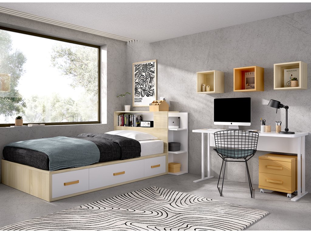 V sestavě studentského pokoje C204 najdete postel se zásuvkami a čelem s nikou a otevřenými policemi. Kompozici doplňuje psací stůl na kovových nohách s dvouzásuvkovým kontejnerem na kolečkách a tři nástěnné police "kostky".