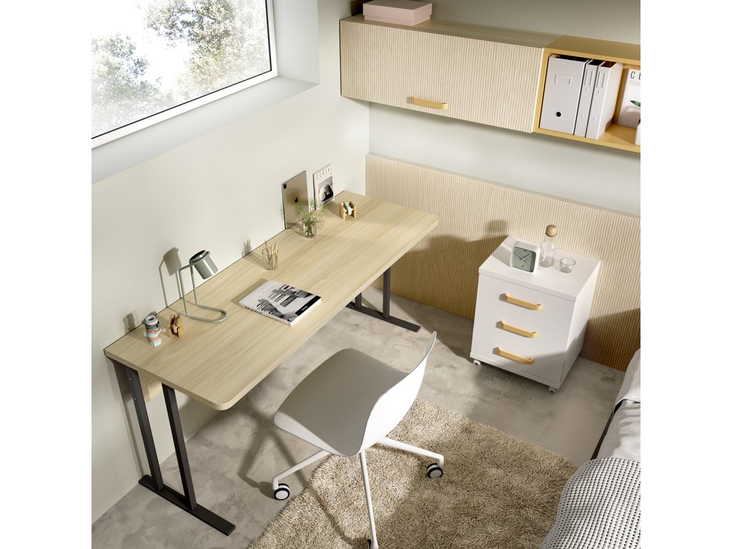 V sestavě studentského pokoje C205 od výrobce Rimobel najdete postel s výklopním roštem a úložným prostorem, psací stůl s mobilním zásuvkovým kontejnerem a nástěnné moduly.
