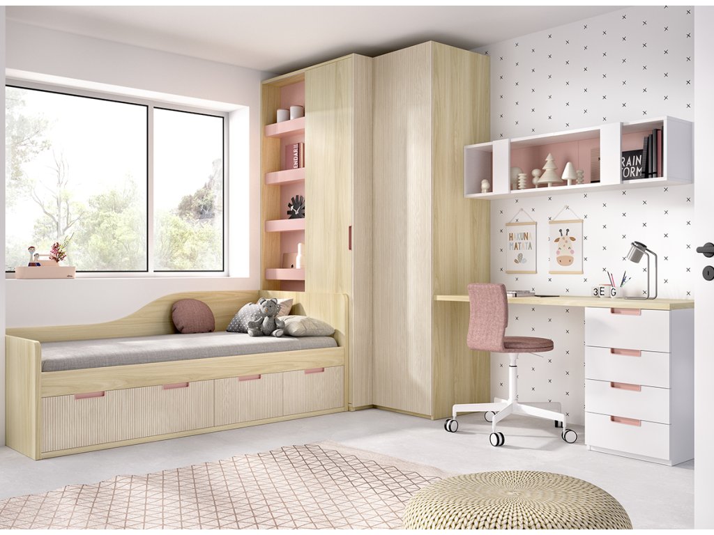 Plně vybavený studentský pokoj v sestavě Rimobel C206 představuje praktické řešení, které šetří místo a přitom nabízí množství úložného prostoru - zásuvky pod vyvýšenou postelí, deignová rohová skříň s knihovnou, navazující psací stůl se zásuvkovým kontejnerem. Rám postele je nutné vybavit roštem, který také rádi zajistíme.