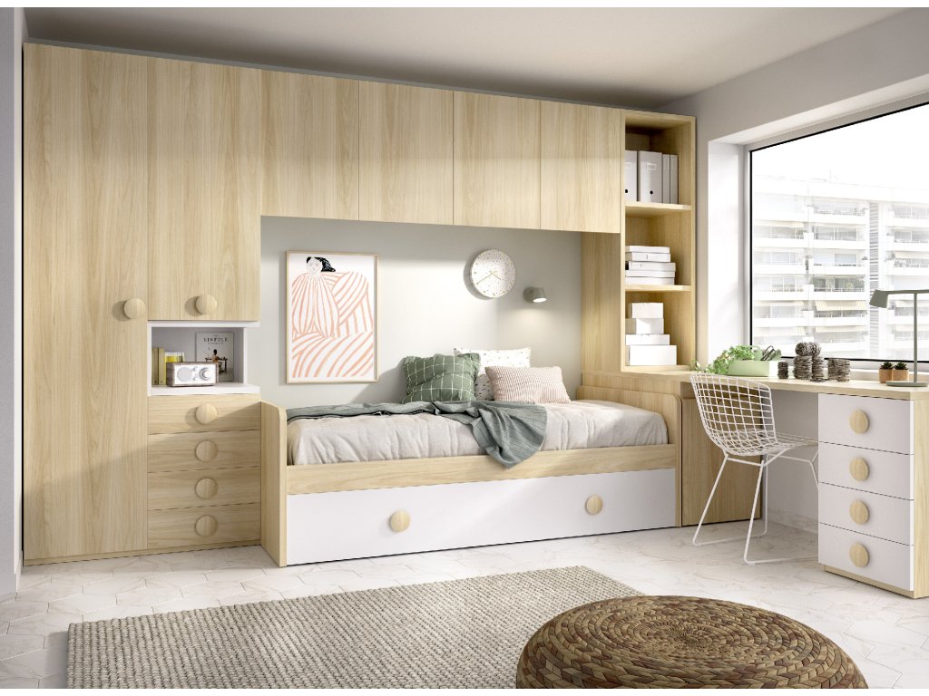 Sestava skříně a skříněk kolem postele s navazujícím psacím stolem se zásuvkami nabízí dostatek úložných prostor pro každého studenta. Pod postelí je další výsuvné lůžko pro kamaráda. Rám postele je nutné vybavit roštem, který také rádi zajistíme.