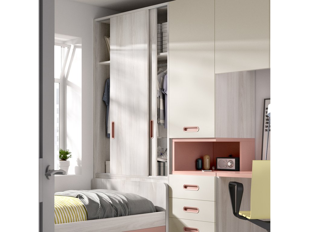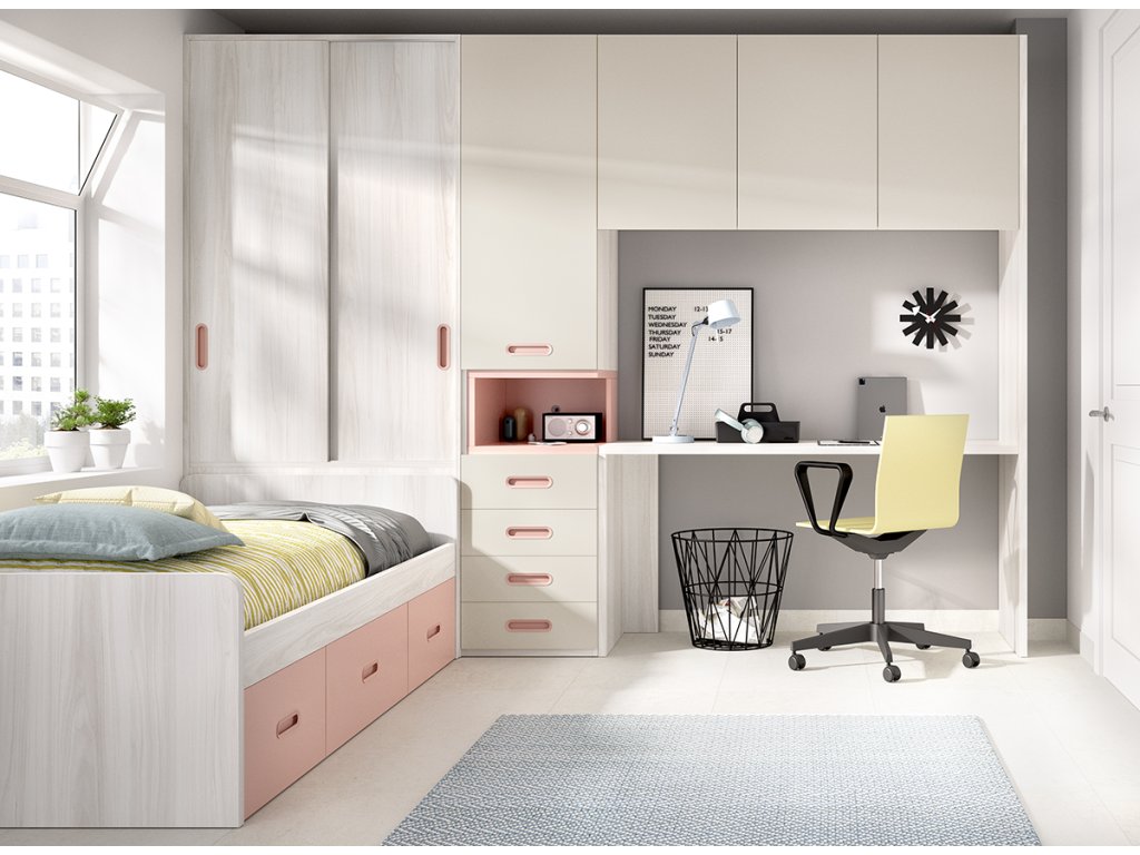 Praktické řešení studentského pokoje od výrobce Rimobel poskytuje velké množství úložných prostor v malém prostoru. Skříně za postelí lze využít na oblečení či na hračky a jiné předměty. Je využit i roh za postelí. Mezi skříní a stolem je šikovná zásuvková skříň s nikou. Psací stůl poskytne kvalitní prostor na studium i volnočasové aktivity. Tento rám postele je vhodný pro uložení roštu (není v ceně).