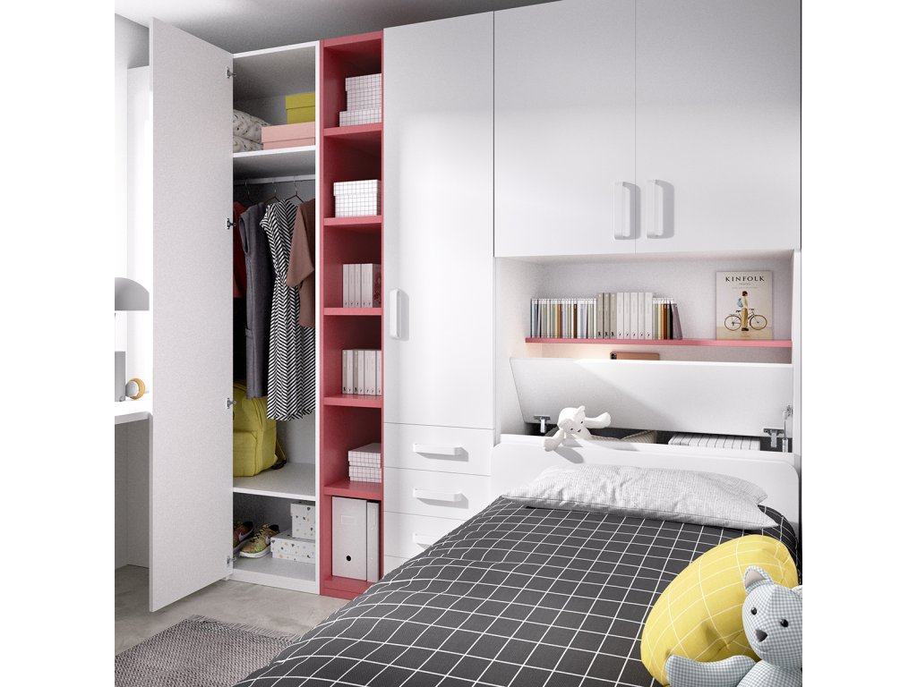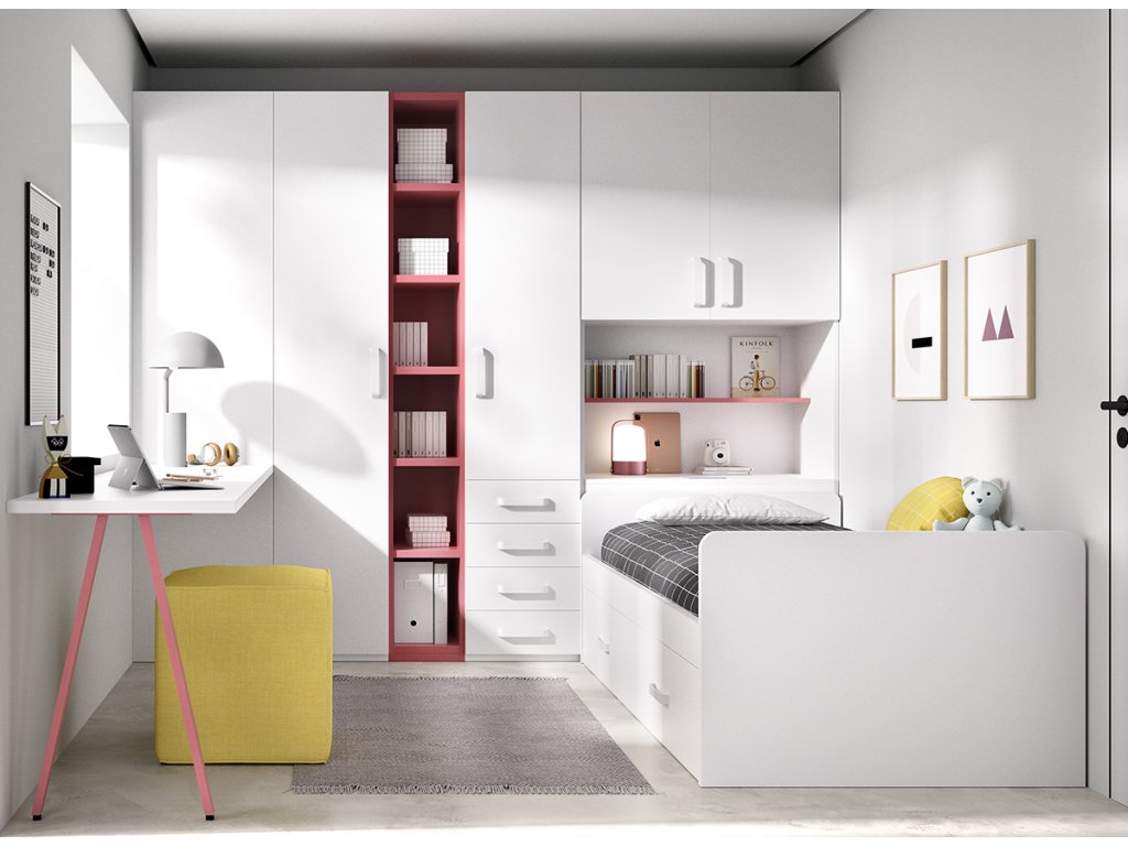 V sestavě studentského pokoje C215 najdete vše potřebné - šatní skříň s bohatým úložným prostorem a barevnou knihovnou, postel s dalším výsuvným lůžkem pro hosty, psací stůl a mobilní zásuvkový kontejner na kolečkách - vše v praktickém uspořádání - prodloužená deska stolu i postel jsou přímo napojeny na skříň, takže nedochází ke ztrátě prostoru v rozích pokoje. Rám postele je nutné vybavit roštem, který také rádi zajistíme.