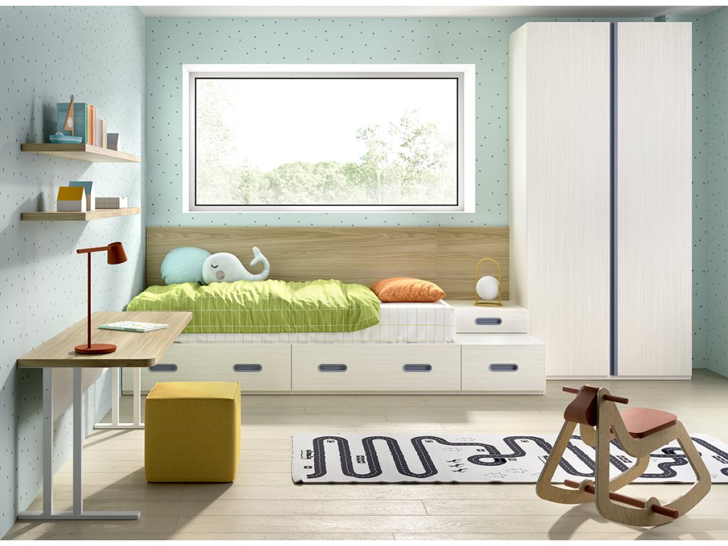 Klasická sestava nábytku Rimobel, která nabízí množství úložného prostoru v rámci postele díky hlubokým zásuvkám. Sestavu doplňuje šatní skříň a psací stůl s nástěnnými policemi.