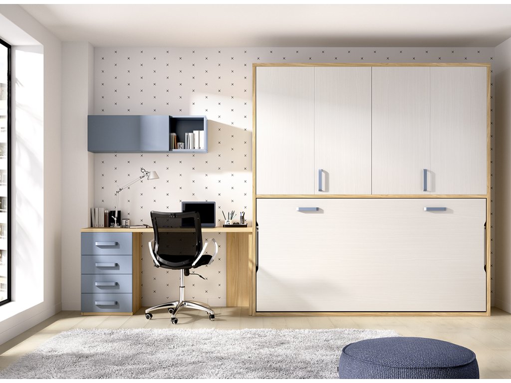 Netradiční, ale velmi praktická a originální sestava nábytku vhodná do menších studentských pokojů, případně do pokoje pro hosty / domácí pracovny. Výklopná postel je vybavena spolehlivým hydraulickým systémem, skrytými poličkami a horními skříněmi na oblečení a další nutnosti. Psací stůl poskytuje dostatek prostoru pro studium a uložení potřebných věcí do zásuvek či nástěnné police s dvířky.