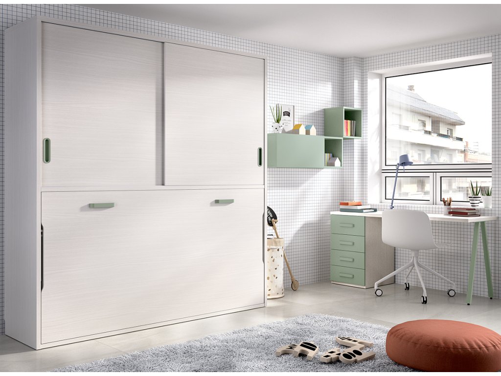 Netradiční, ale velmi praktická a originální sestava nábytku vhodná do menších studentských pokojů, případně do pokoje pro hosty / domácí pracovny. Výklopná postel je vybavena spolehlivým hydraulickým systémem, skrytými poličkami a horními skříněmi na oblečení a další nutnosti. Psací stůl poskytuje dostatek prostoru pro studium a uložení potřebných věcí do zásuvek či nástěnné police s dvířky.
