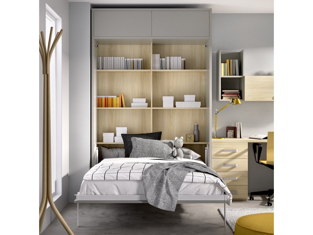 Velmi praktická a originální sestava nábytku vhodná do menších studentských pokojů, případně do pokoje pro hosty / domácí pracovny. Výklopná postel (vhodná pro matraci širokou 140 x 195 cm) je vybavena spolehlivým hydraulickým systémem a doplněna dalším úložným prostorem s výklopnými dvířky. Sestavu doplňuje psací stůl se zásuvkami a nástěnné moduly.