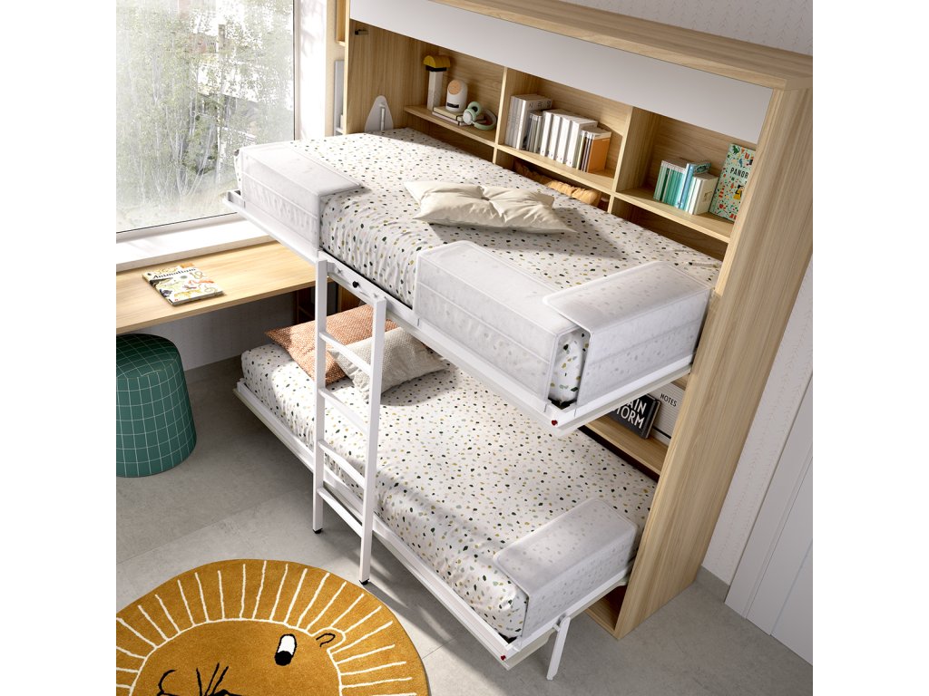 Originální sestava nábytku vhodná do menších studentských pokojů, případně do pokoje pro hosty. Výklopné patrové postele jsou vybaveny spolehlivým hydraulickým systémem a sklopnými zábranami, které při sklápění postele drží matrace na místě. K širokému psacímu stolu se pohodlně vejdou dvě děti. Sestavu je samozřejmě možné doplnit o další nábytek dle možností prostoru a požadavků.
