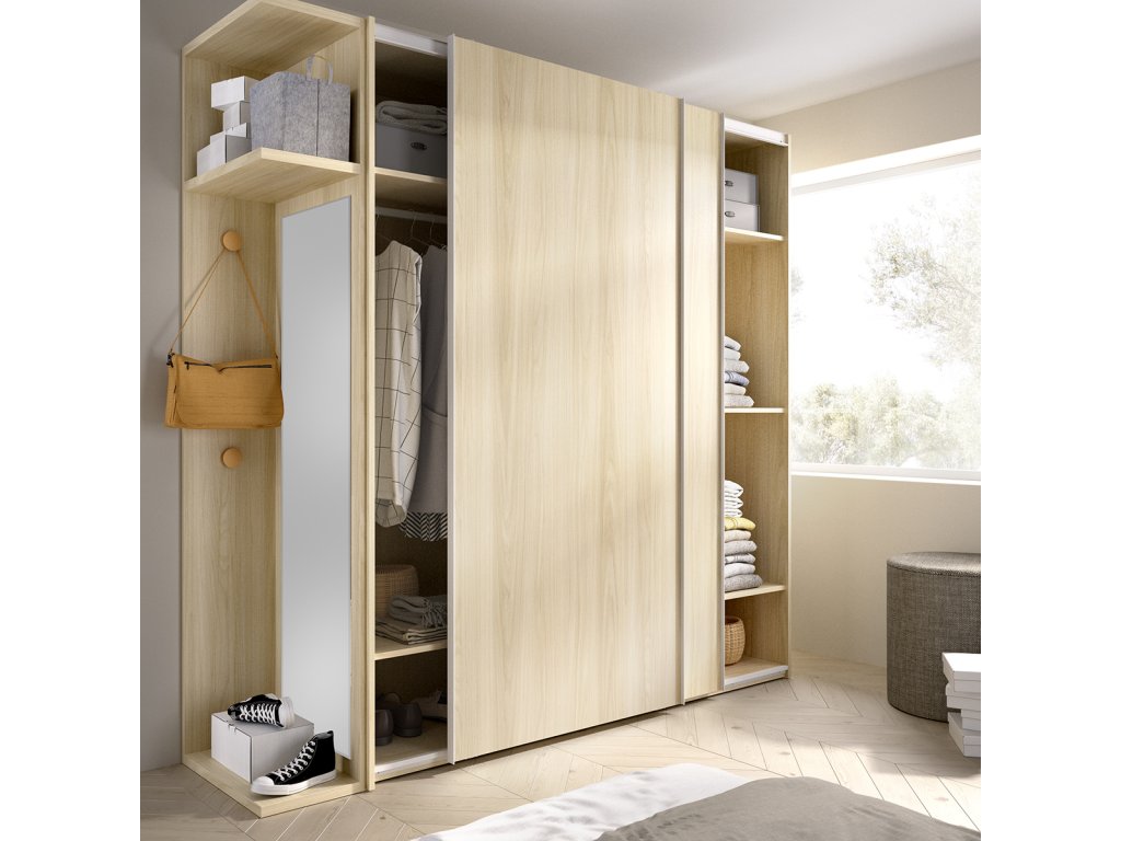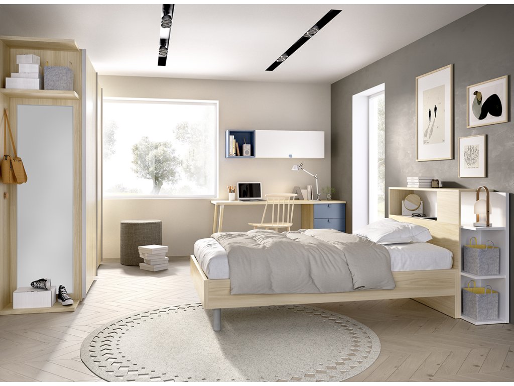 Sestava C503 představuje originální novinku - čelo postele s otevřenou nikou a policemi. Rám postele je určen pro uložení roštu (není v ceně). Celá sestava působí vdušně a prostorně díky umístění postele a stolu na nožičky. Rovněž šatní skříň působí díky bočním otevřeným policím méně robustně.