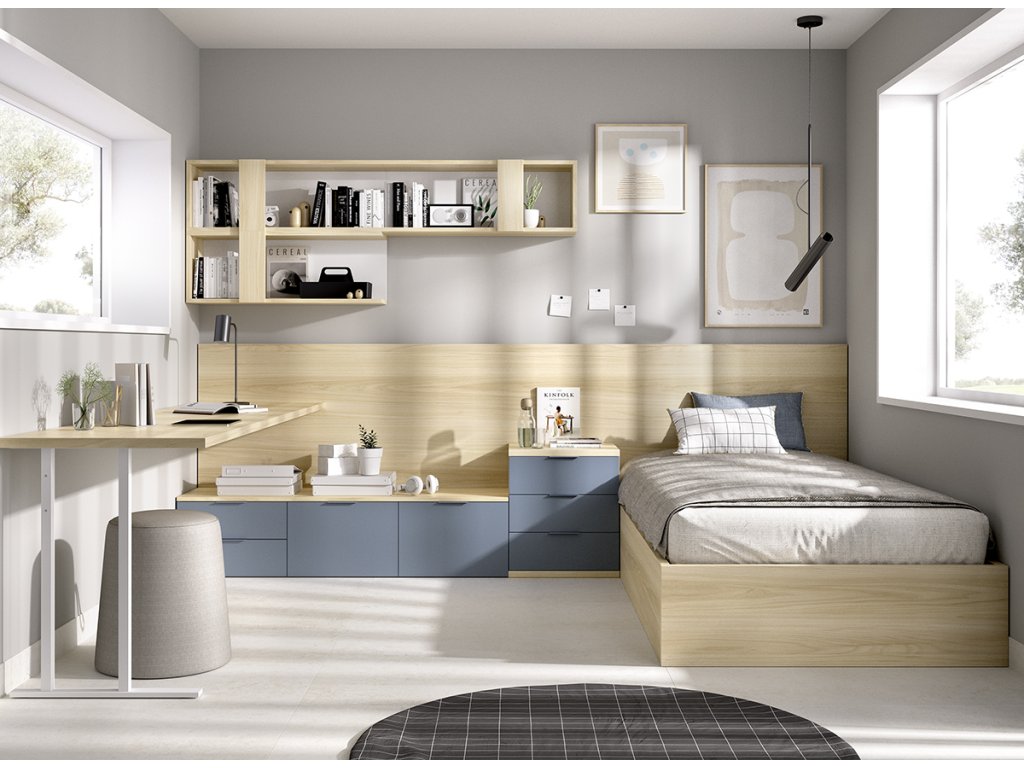 Klasický rám postele s výklopným roštem a úložný prostor je v tomto modelu ozvláštněn o zásuvkové moduly. Díky prodlouženému čelu působí postel velmi útulně, na čelo navíc elegantně navazuje psací stůl s kovovu nohou. Celek působí nadčasově a vzdušně, je možné jej doplnit o šatní skříň či další nábytek.
