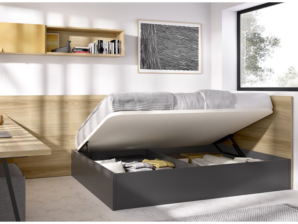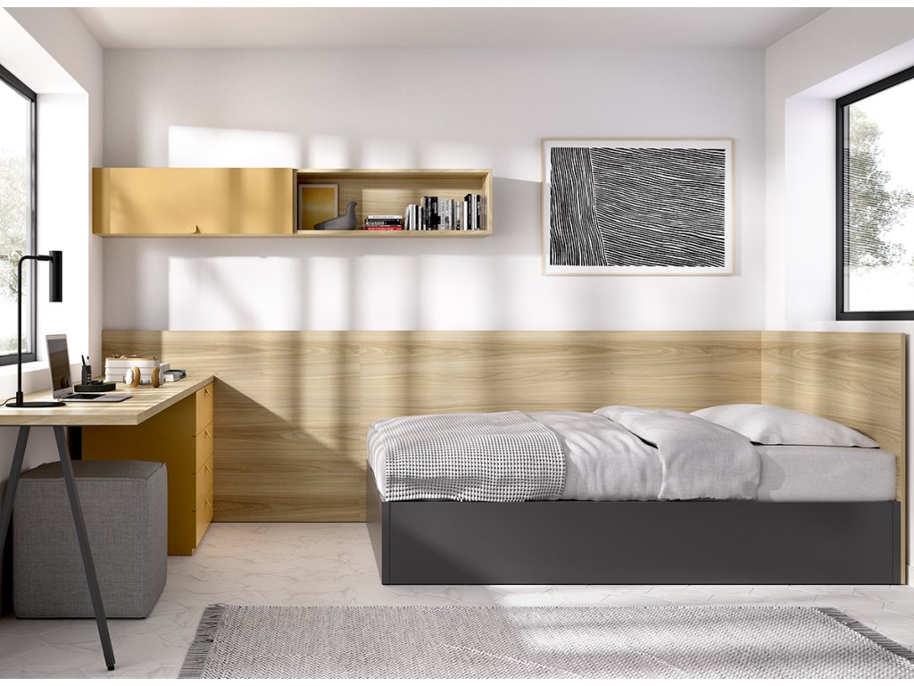 Klasický rám postele s výklopným roštem, pod kterým najdete úložný prostor. Díky vysokým a prodlouženým čelům působí postel velmi útulně. Psací stůl se zásuvkovým kontejnerem navazuje na prodloužené čelo postele.