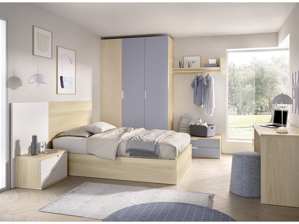 Minimalistický rám postele s vysokým čelem prodlouženým do strany za noční stolek. V sestavě je dále vše nutné - prostorná šatní skříň s nízkou komodou a policí s šatní tyčí na věšení roznošeného oblečení a psací stůl se zásuvkovým kontejnerem. Nábytek Rimobel je v minimalistickém a nadčasovém designu.